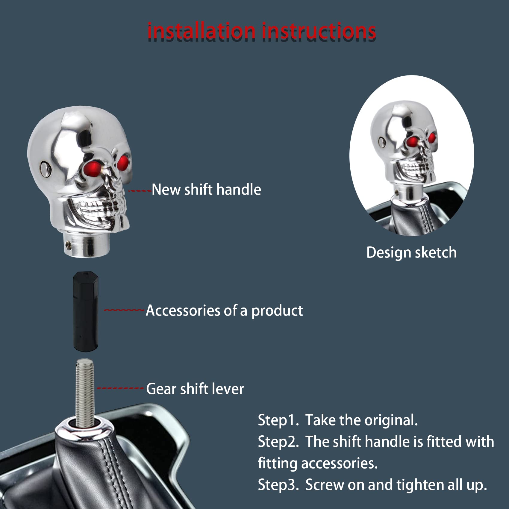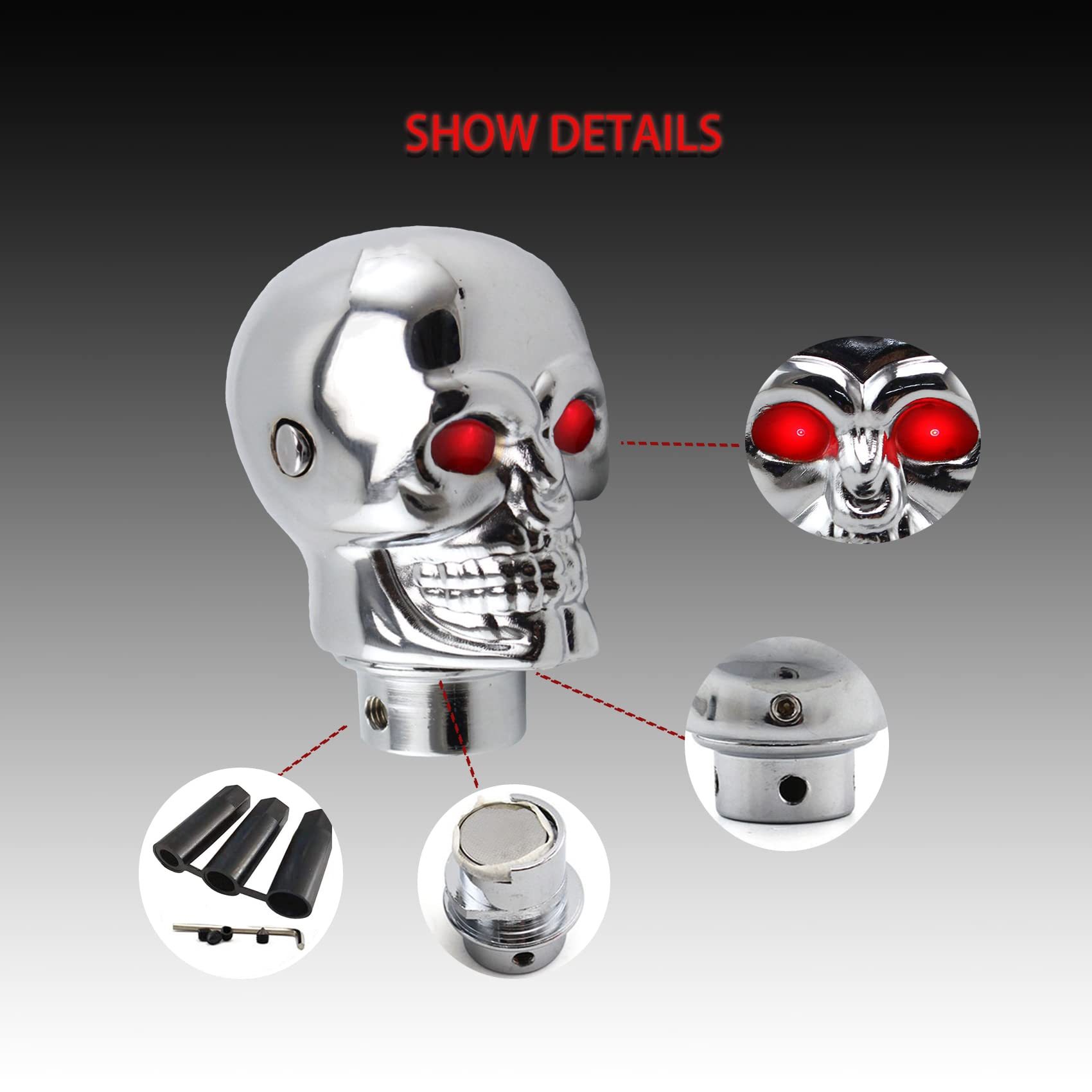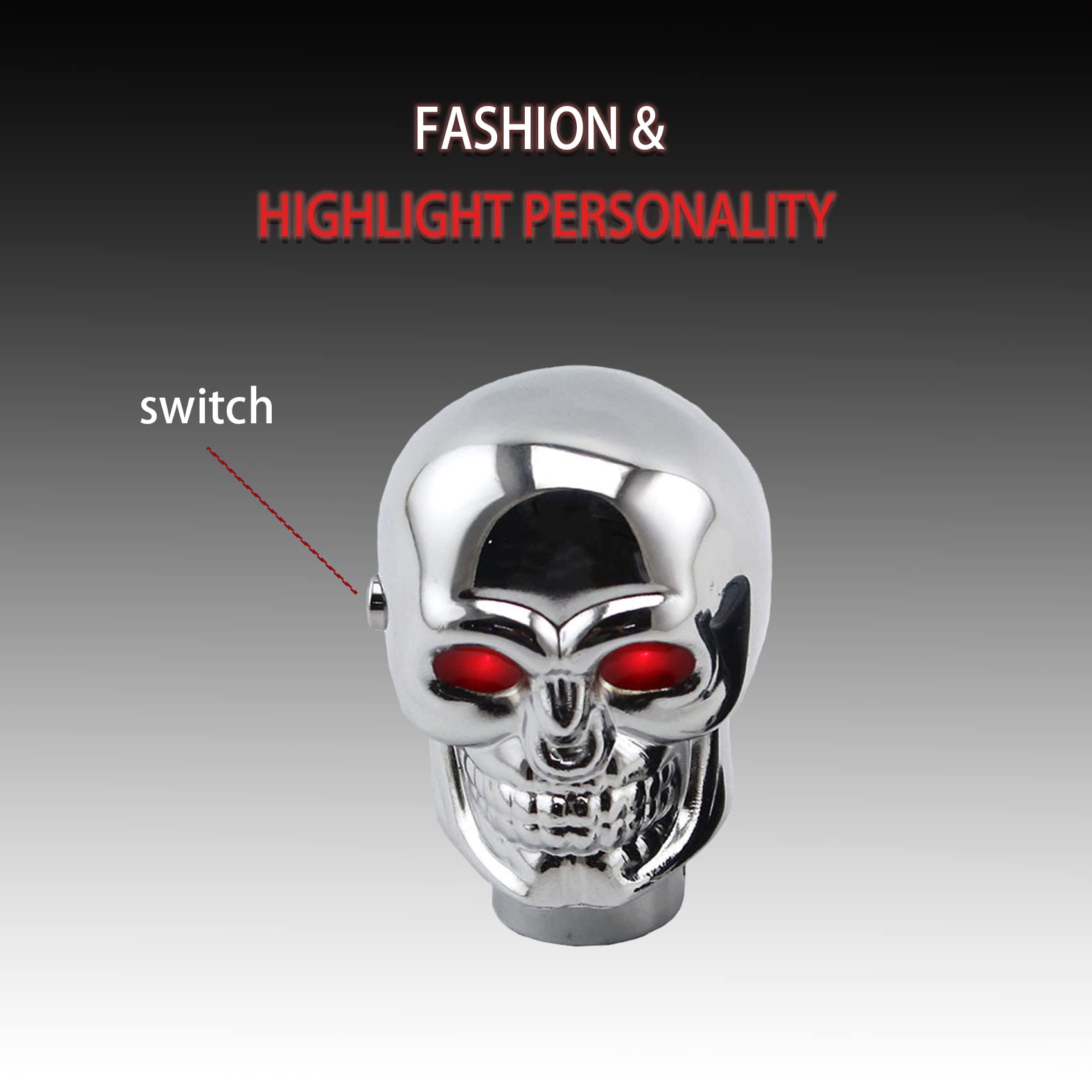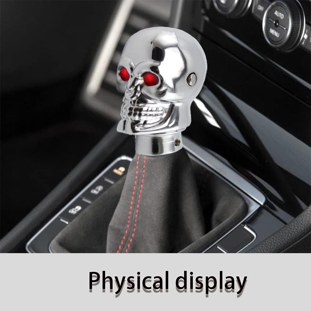 [Appearance of Skull Shift Knobs]: Universal Skull Head Gear Shift Knobs eyes can emit different colors of light, red and blue. Show your personal taste and make your car more special and cool. It is the best gift for friends, family and classmates.