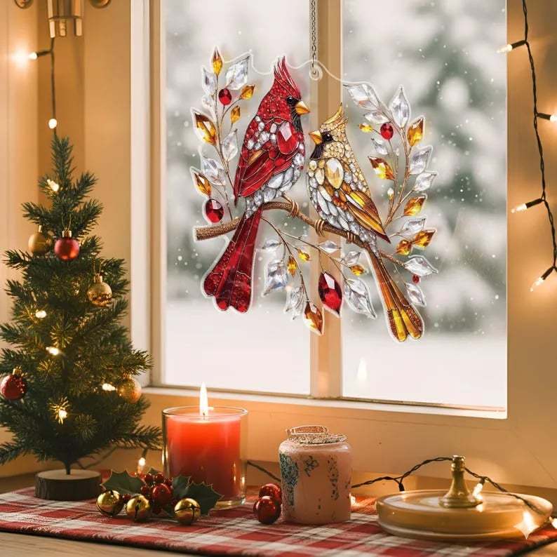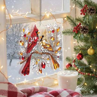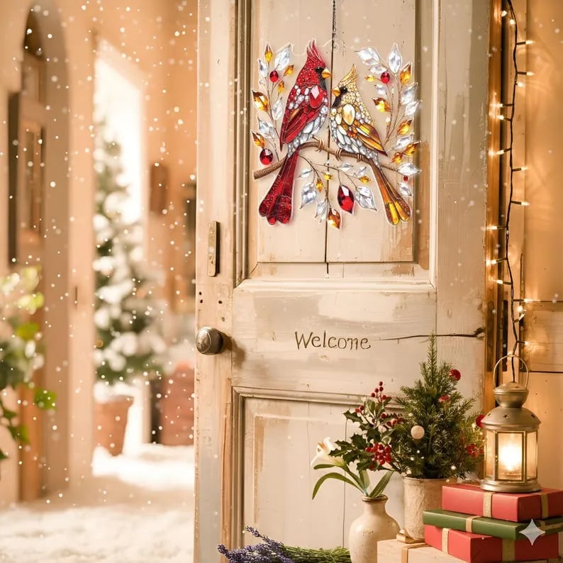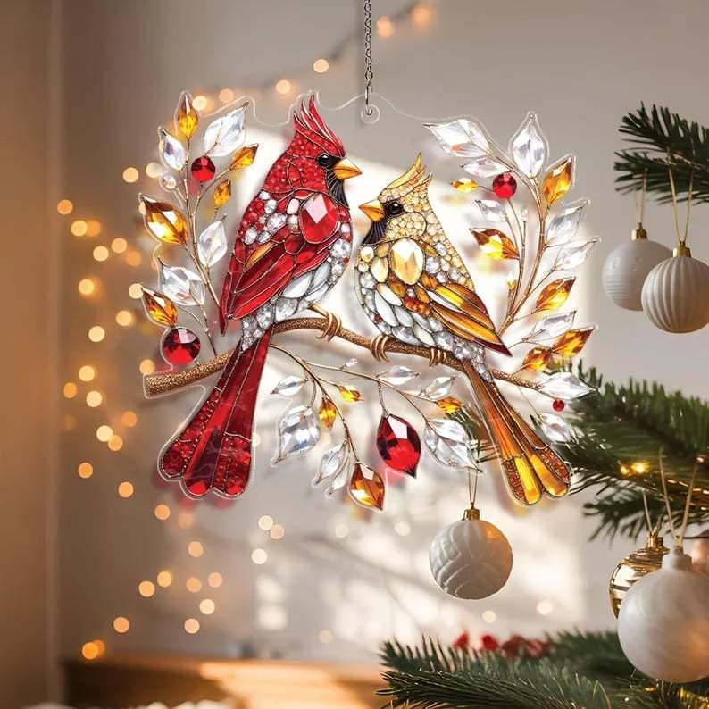 🎄 Featuring a vibrant male and a gentle female cardinal perched on frosted branches, it’s a timeless keepsake of companionship and joy.