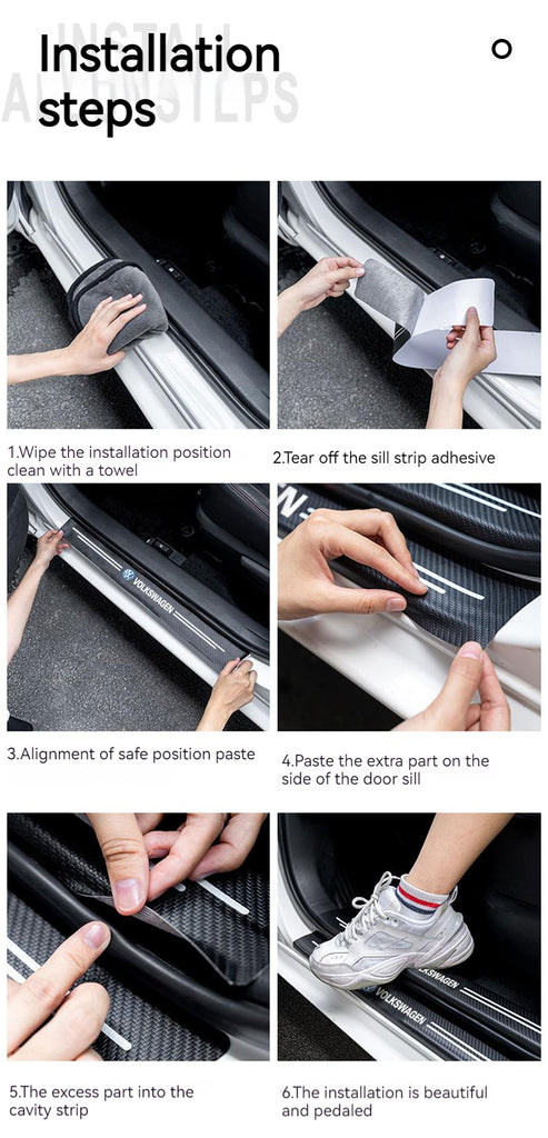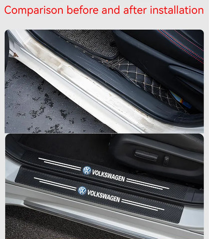 - High-quality material: 4D carbon fiber black sticker. The door sill guard is made of vinyl film with carbon fiber texture design. waterproof and high temperature resistance. After several tests on high temperature and rainy days. we found that it did not melt and crack. High quality is our pursuit. and we believe in you.
